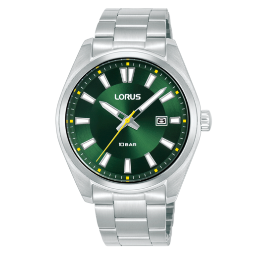 Reloj Lorus Hombre RH921SX9 Acero Analógico. Caja de acero de 42mm de diámetro. Bisel plateado. Brazalete de acero inoxidable. Cierre desplegable. Esfera verde. Multifunción, calendario. Cristal mineral. Movimiento quartz. Sumergible 100m. 3 años de garantía. Ref RH921SX9