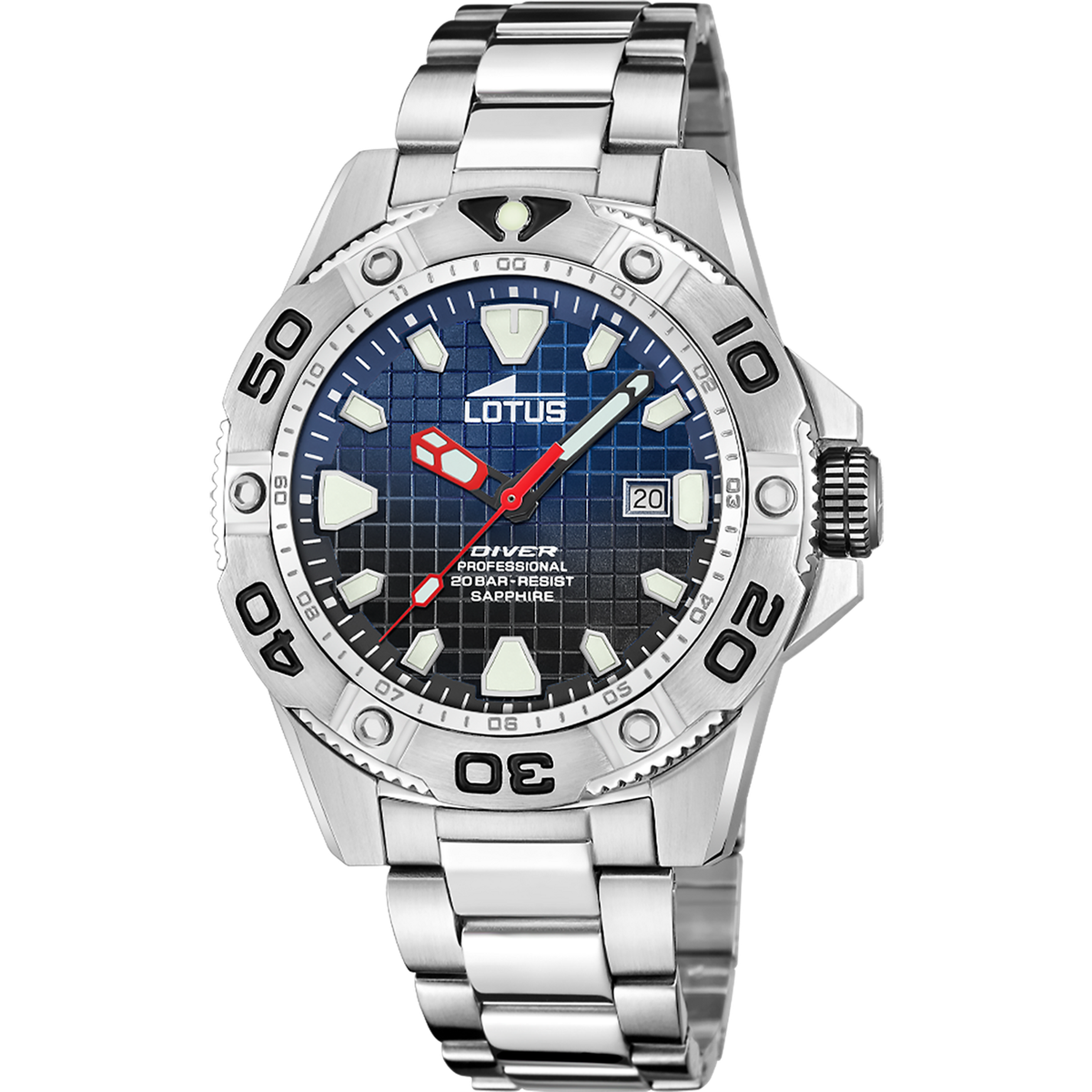 Reloj Lotus Hombre 18929/E Acero Plateado Analógico. Caja de acero plateado de 45mm de diámetro. Bisel giratorio plateado. Brazalete de acero plateado. Cierre desplegable. Esfera azul. Multifunción, calendario. Cristal zafiro. Movimiento quartz. Sumergible 200m. Peso 177,32gr. 3 años de garantía. Ref 18929/E