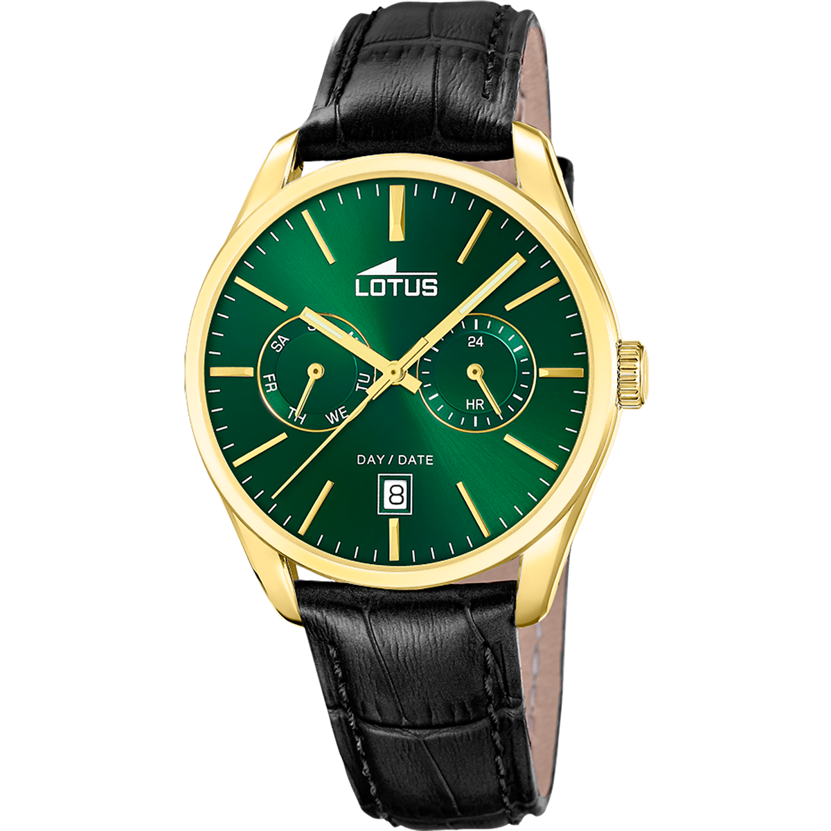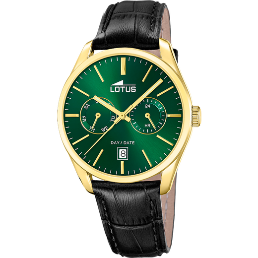 Reloj Lotus Hombre 19075/3 Piel Negra Acero Dorado Analógico. Caja de acero dorado de 42mm de diámetro. Bisel dorado. Correa de piel negra. Cierre desplegable. Esfera verde. Multifunción, calendario. Cristal mineral. Movimiento quartz. Sumergible 50m. Peso 58,51gr. 3 años de garantía. Ref 19075/3