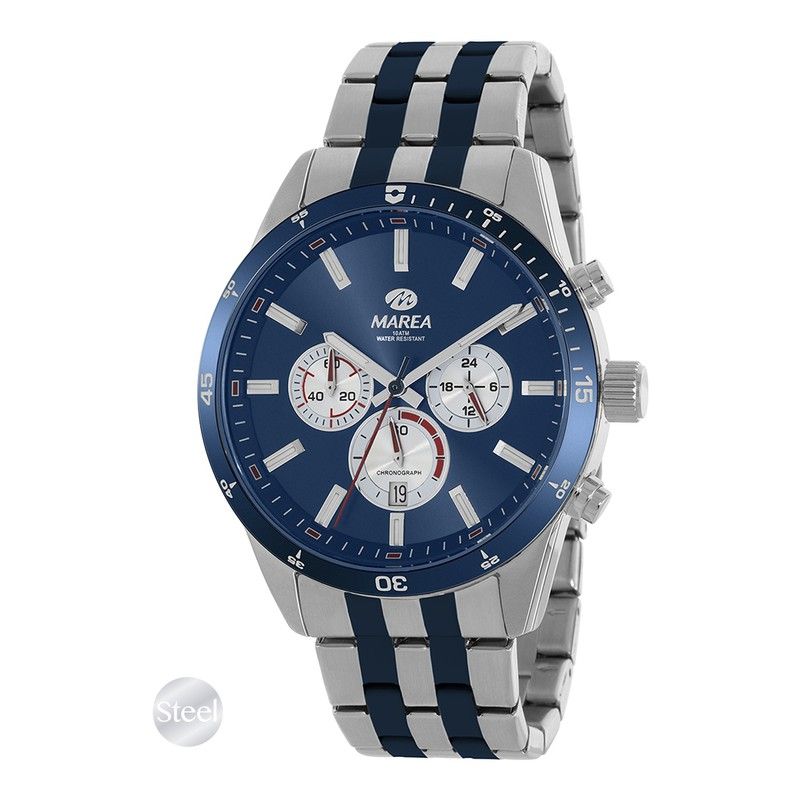Reloj Marea Hombre B36198/2 Acero Bicolor Azul. Caja de acero de 44mm. Bisel de acero azul. Brazalete de acero bicolor azul. Cierre desplegable. Esfera azul. Multifunción, calendario, cronómetro. Cristal mineral. Movimiento quartz. Sumergible 100m. 3 años de garantía. Ref B36198/2
