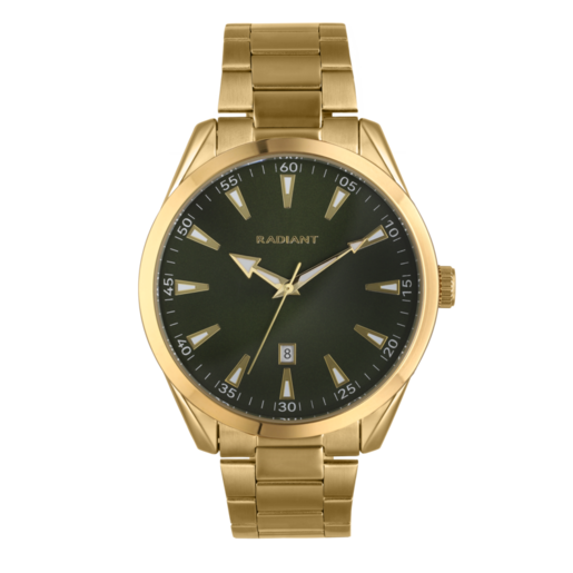 Reloj Radiant Hombre RA695205 Acero Dorado Analógico. Caja de acero dorado de 42mm de diámetro. Bisel dorado. Brazalete de acero inoxidable dorado. Cierre desplegable. Esfera verde. Multifunción, calendario. Cristal mineral. Movimiento quartz. Sumergible 50m. 3 años de garantía. Ref RA695205