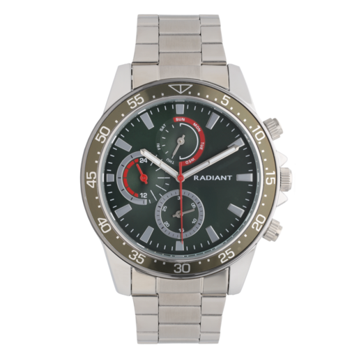 Reloj Radiant Hombre RA696703 Cronógrafo Acero Analógico. Caja de acero de 44mm de diámetro. Bisel gris. Brazalete de acero inoxidable. Cierre desplegable. Esfera gris bicolor verde. Multifunción, cronógrafo. Cristal mineral. Movimiento quartz. Sumergible 50m. 3 años de garantía. Ref RA696703