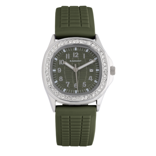 Reloj Radiant Mujer RA690204 Sport Verde Acero Analógico. Caja de acero de 34mm de diámetro. Bisel plateado con circonitas. Correa de silicón verde. Cierre hebilla. Esfera gris. Multifunción, calendario. Cristal mineral. Movimiento quartz. Sumergible 30m. 3 años de garantía. Ref RA690204